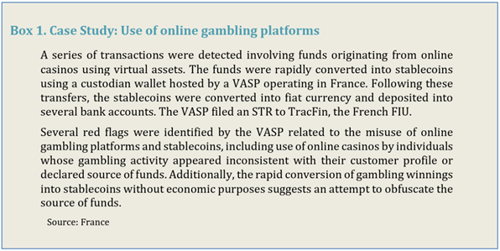 Funds originated from online gambling platforms using virtual assets. These funds were quickly converted into stablecoins through a custodian wallet hosted by a VASP in France. After conversion, the stablecoins were converted into fiat currency and spread across several bank accounts. The VASP, recognising suspicious behaviour, filed an STR to the French FIU.
